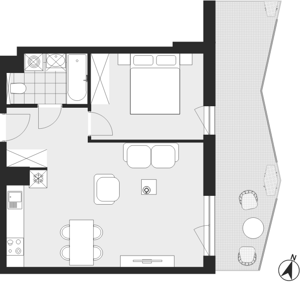- Charakterystyka mieszkania: 45,39 m², 2 pokoje, 1 łazienka; stan: deweloperski