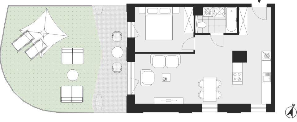 Funkcjonalne, 2-pokojowe mieszkanie z aneksem kuchennym, łazienką i tarasem z ogródkiem. Lokal znajduje się w inwestycji Semiramis w Katowicach.